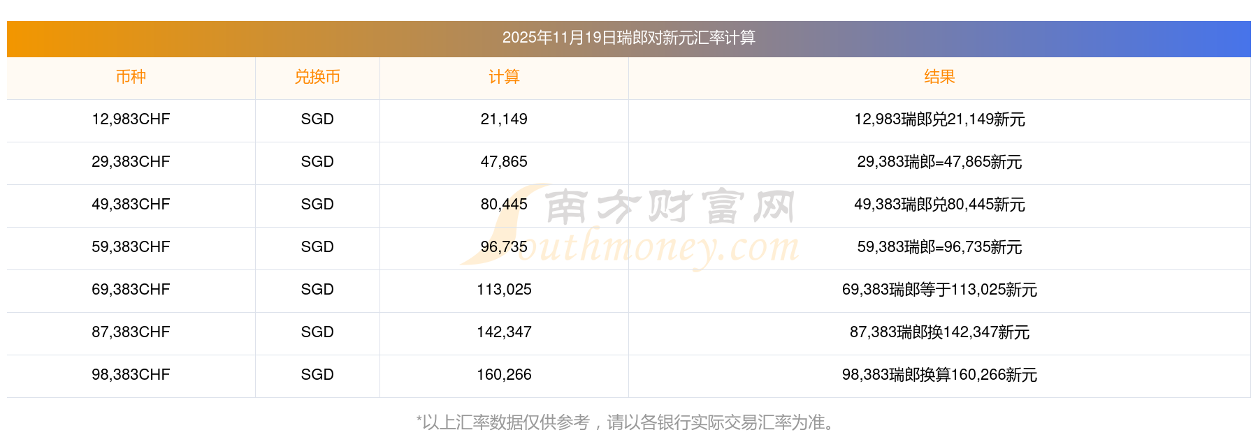 南方財富網(wǎng)為您提供瑞郎對新元匯率最新價格詳情。