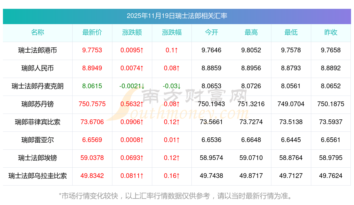 2025年11月19日瑞士法郎相關匯率查詢
