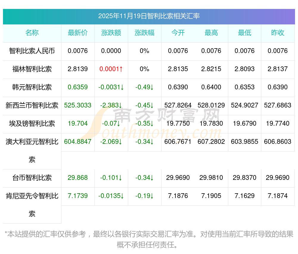 2025年11月19日最新消息,智利比索兌換新西蘭元最新匯率為0.001903,今開為0.0019,昨收為0.0019,最高為0.0019,最低為0.0019。