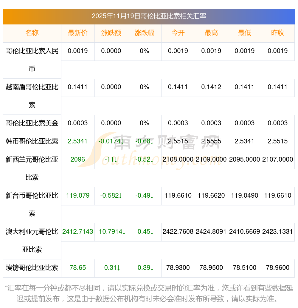 2025年11月19日哥倫比亞比索相關(guān)匯率查詢