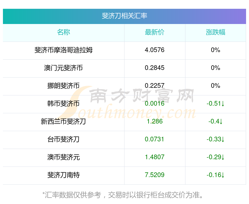 南方財富網(wǎng)為您提供斐濟刀對南特匯率最新價格詳情。