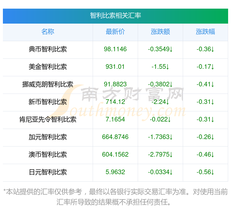 南方財(cái)富網(wǎng)為您提供智利比索對(duì)人民幣匯率最新價(jià)格詳情。