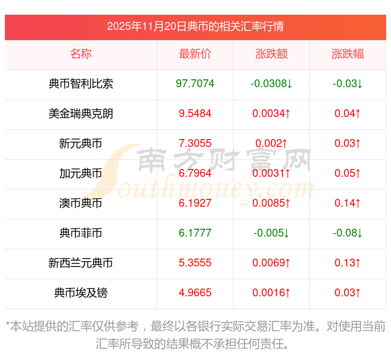 根據(jù)今天2025年11月20日匯率計(jì)算,SEK兌換CLP匯率最新價(jià)97.707369,今開價(jià)97.7376,昨收價(jià)97.7381,最高價(jià)97.8016,最低價(jià)97.6951。