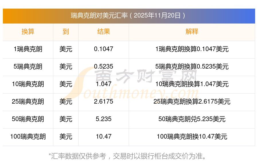 今日瑞典克朗匯率_瑞典克朗轉(zhuǎn)換美元匯率計(jì)算表 11月20日