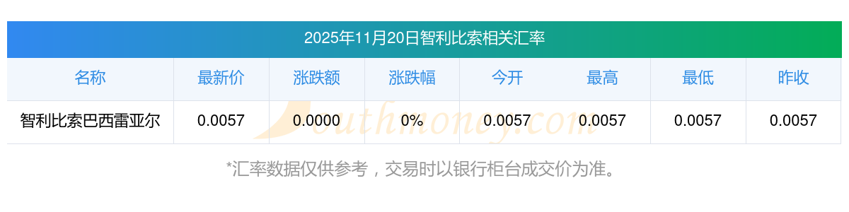根據(jù)2025年11月20日匯率計算,CLP兌換BRL匯率最新價0.005720:今日開價0.0057,昨日收價0.0057,最高價0.0057,最低價0.0057。