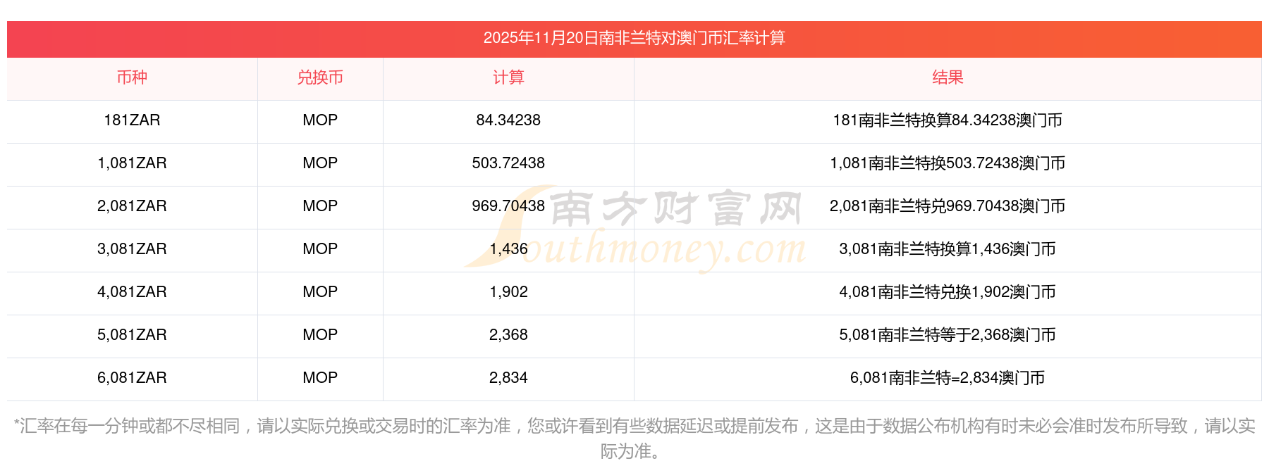 2025年11月20日南非蘭特與澳門幣的兌換匯率計(jì)算如下:
