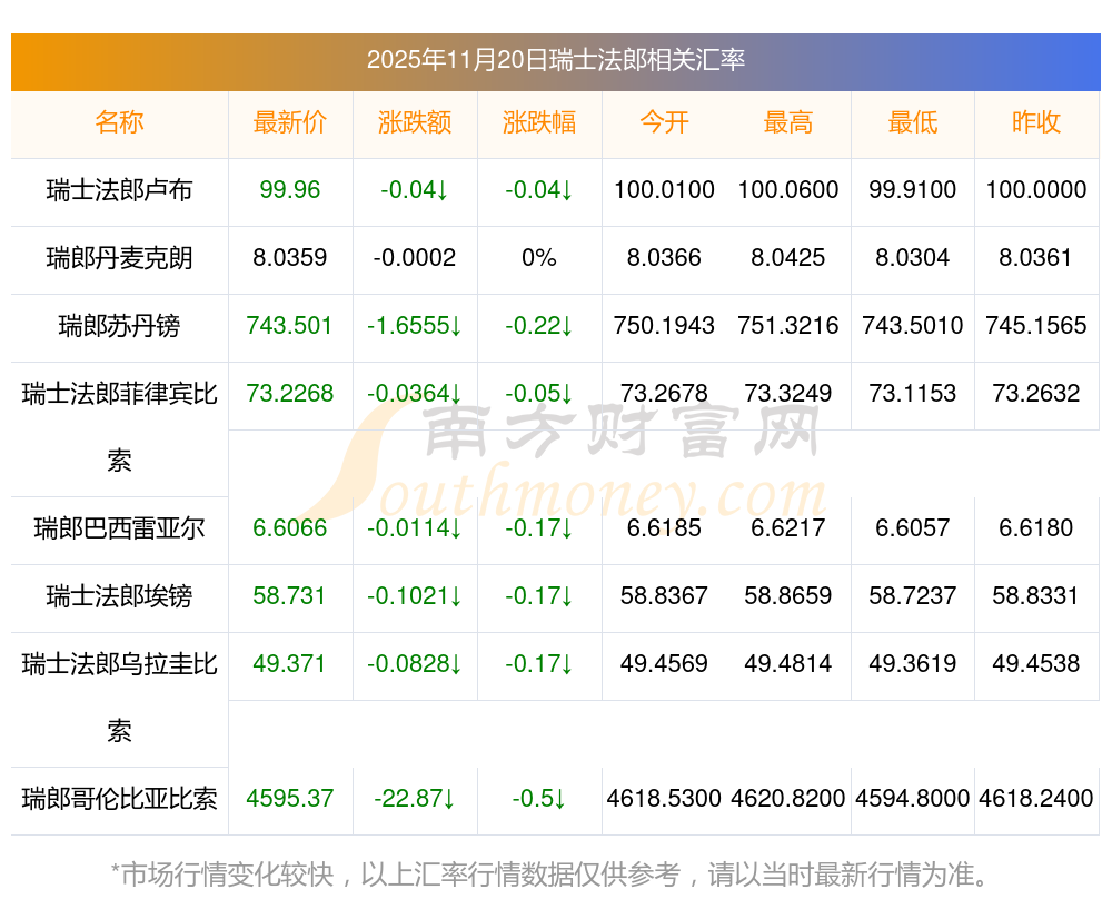 2025年11月20日瑞士法郎相關(guān)匯率查詢