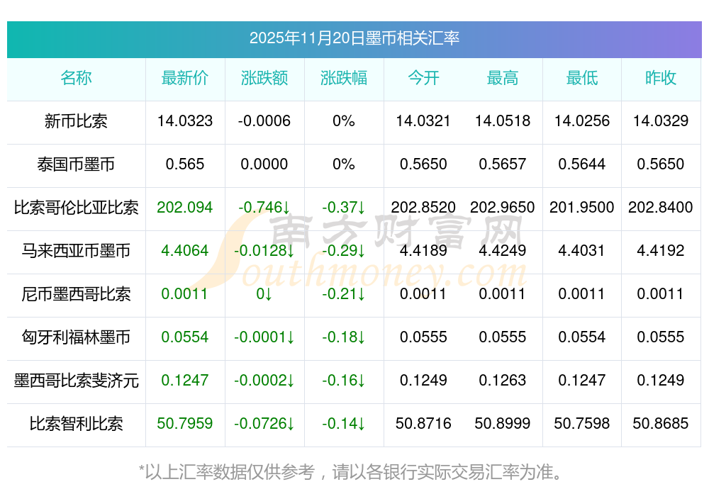 2025年11月20日墨幣兌換巴西雷亞爾最新匯率:0.290540,今開:0.2907,昨收:0.2907,最高:0.2909,最低:0.2903。