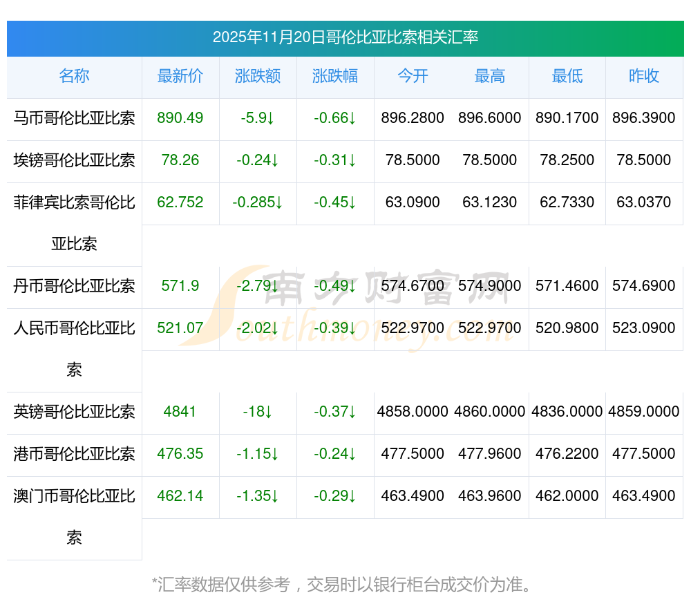 2025年11月20日哥倫比亞比索相關(guān)匯率查詢(xún)