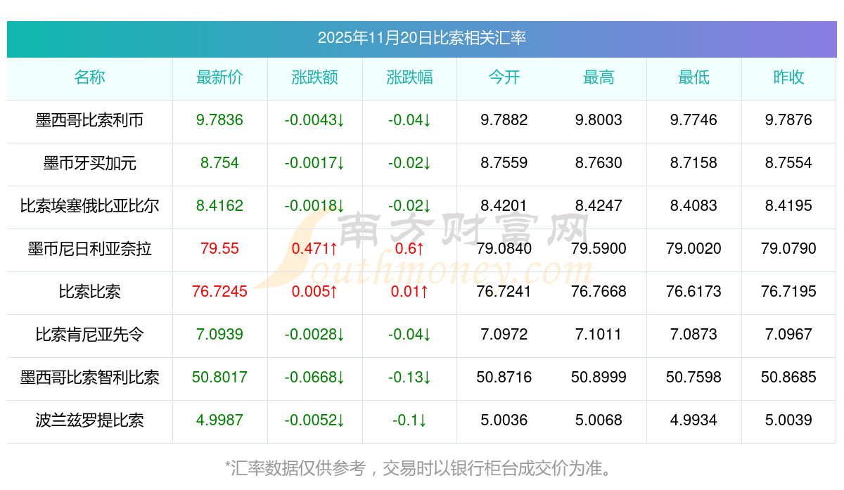 2025年11月20日最新消息,比索兌換比索最新匯率為76.724490,今開(kāi)為76.7241,昨收為76.7195,最高為76.7668,最低為76.6173。