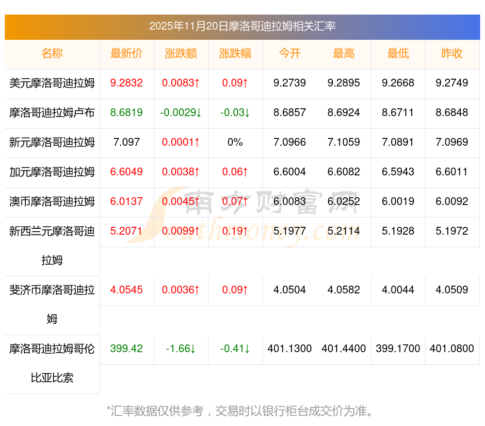 2025年11月20日摩洛哥迪拉姆相關匯率查詢