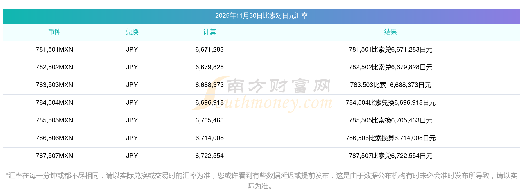 南方財富網(wǎng)為您提供比索對日元匯率最新價格詳情。