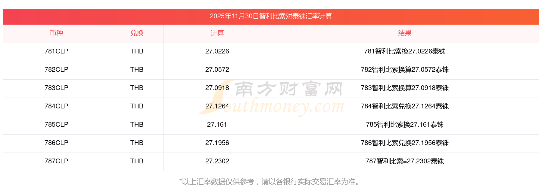 南方財富網(wǎng)為您提供智利比索對泰銖匯率最新價格詳情。