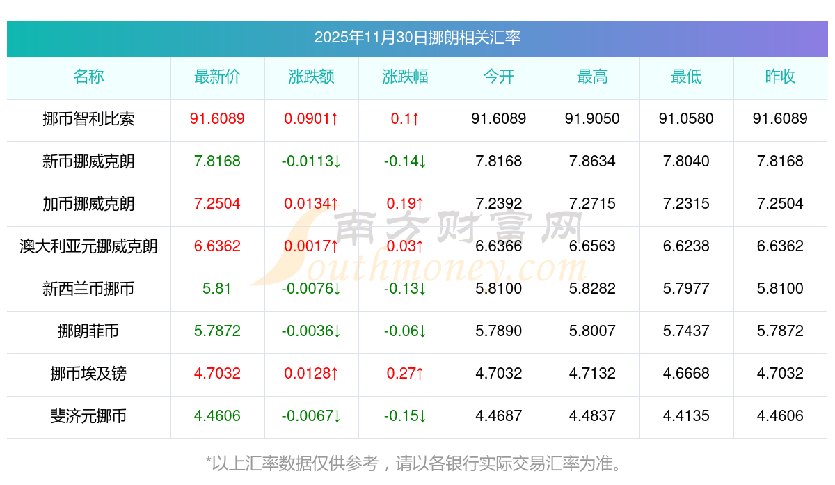根據(jù)2025年11月30日匯率計算,NOK兌換TWD匯率最新價3.098600:今開價3.0818,昨收價3.0986,最高價3.1073,最低價3.0758。