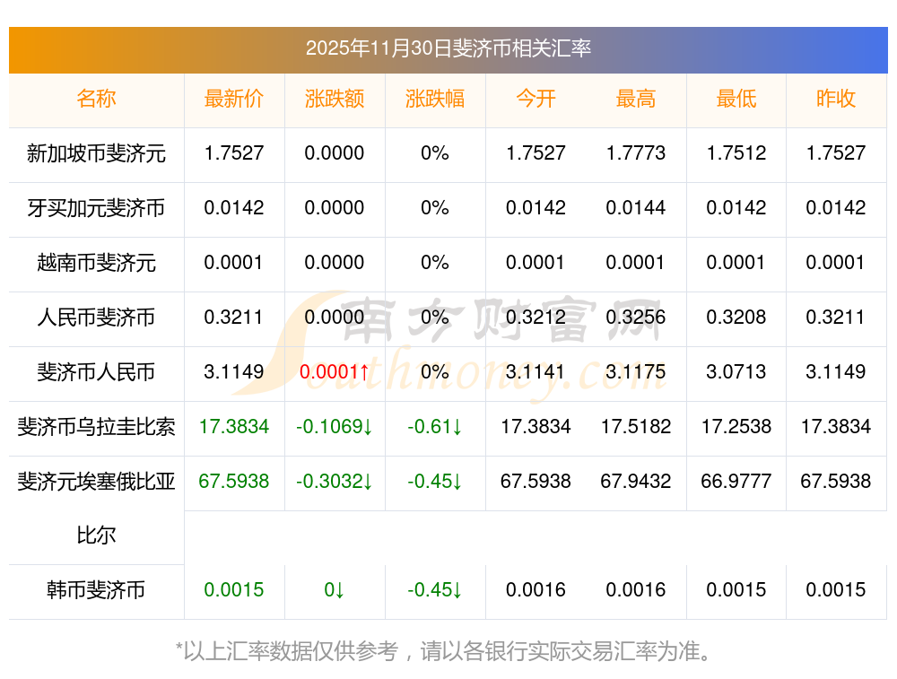2025年11月30日斐濟幣相關(guān)匯率查詢
