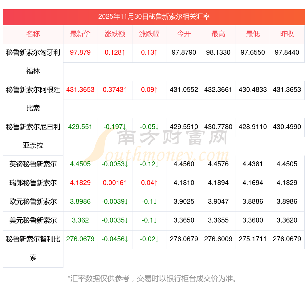 2025年11月30日秘魯新索爾相關(guān)匯率查詢