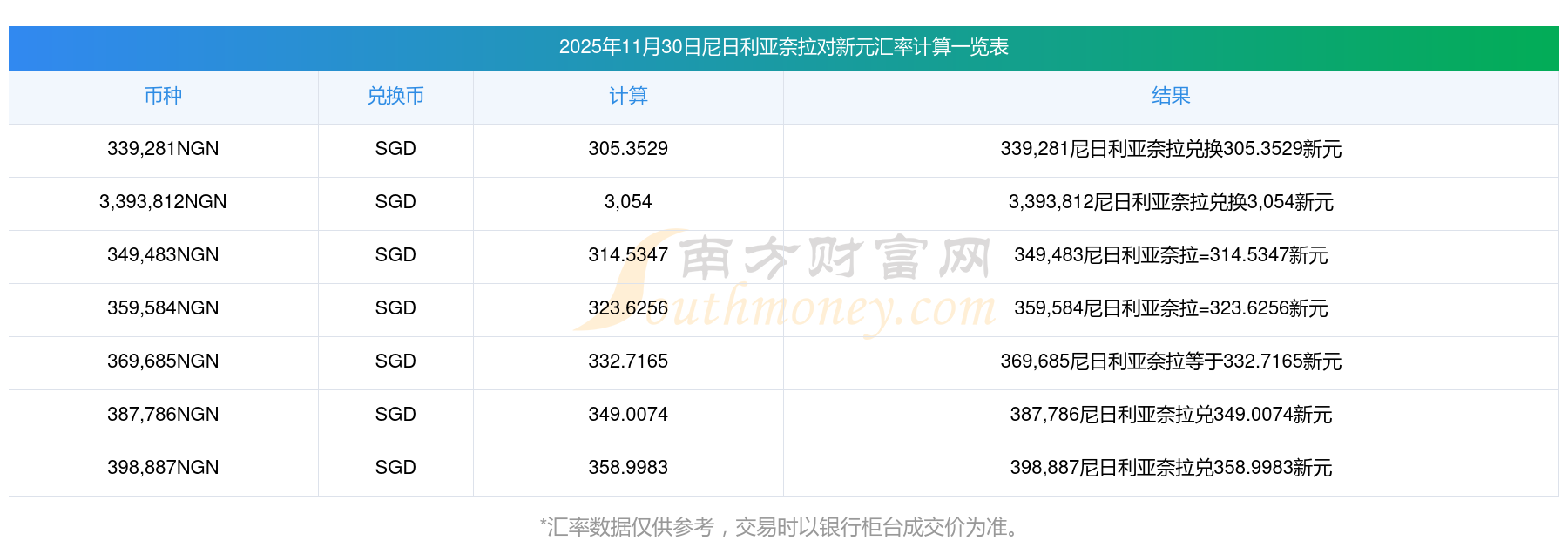 匯率實(shí)時更新!66尼日利亞奈拉兌換新元匯率表(2025年11月30日)