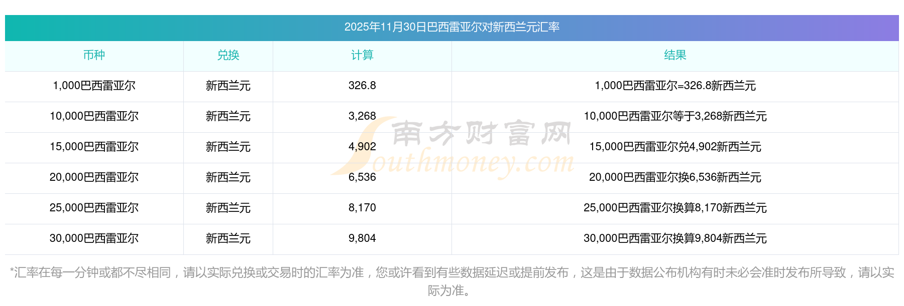 2025年11月30日巴西雷亞爾兌換新西蘭元匯率是:0.3268