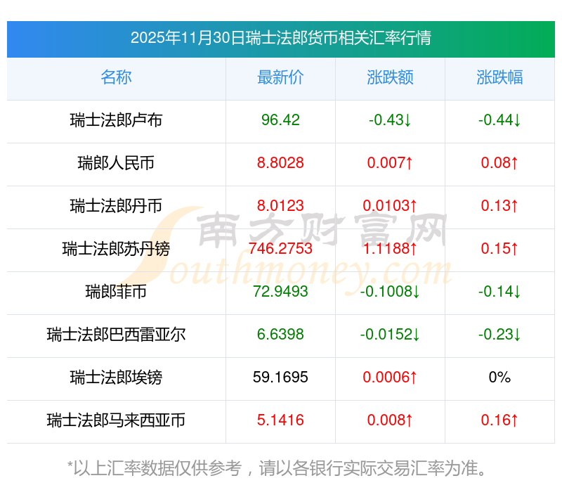 2025年11月30日瑞士法郎相關(guān)匯率查詢