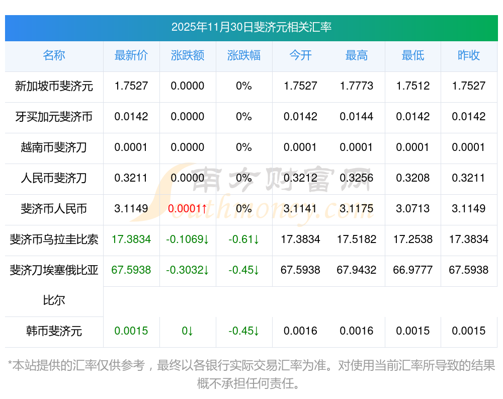 2025年11月30日斐濟(jì)元相關(guān)匯率查詢