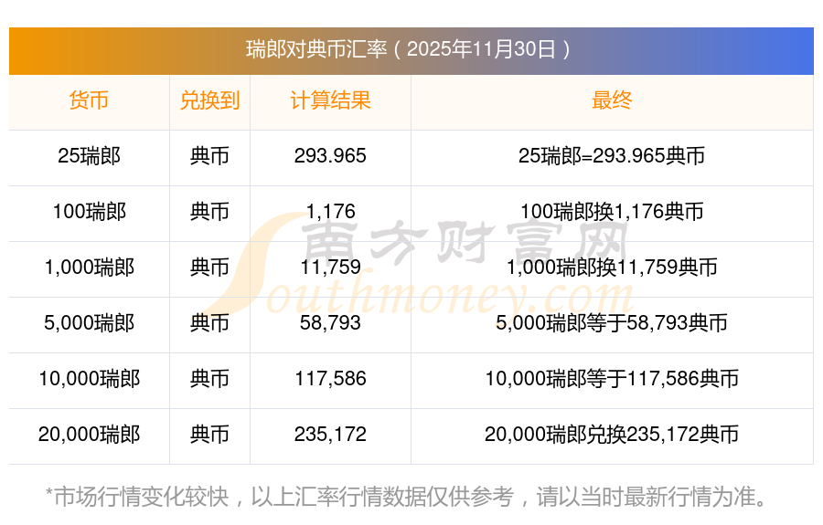南方財富網(wǎng)為您提供瑞郎對典幣匯率最新價格詳情。