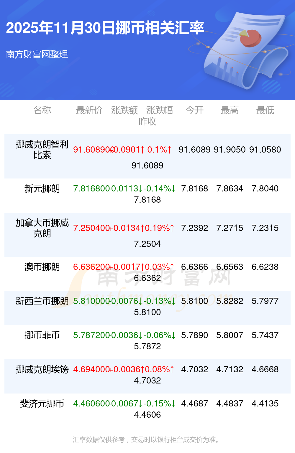 根據(jù)2025年11月30日匯率計算,NOK兌換MXN匯率最新價1.805800:今日開價1.8063,昨日收價1.8058,最高價1.8130,最低價1.7996。