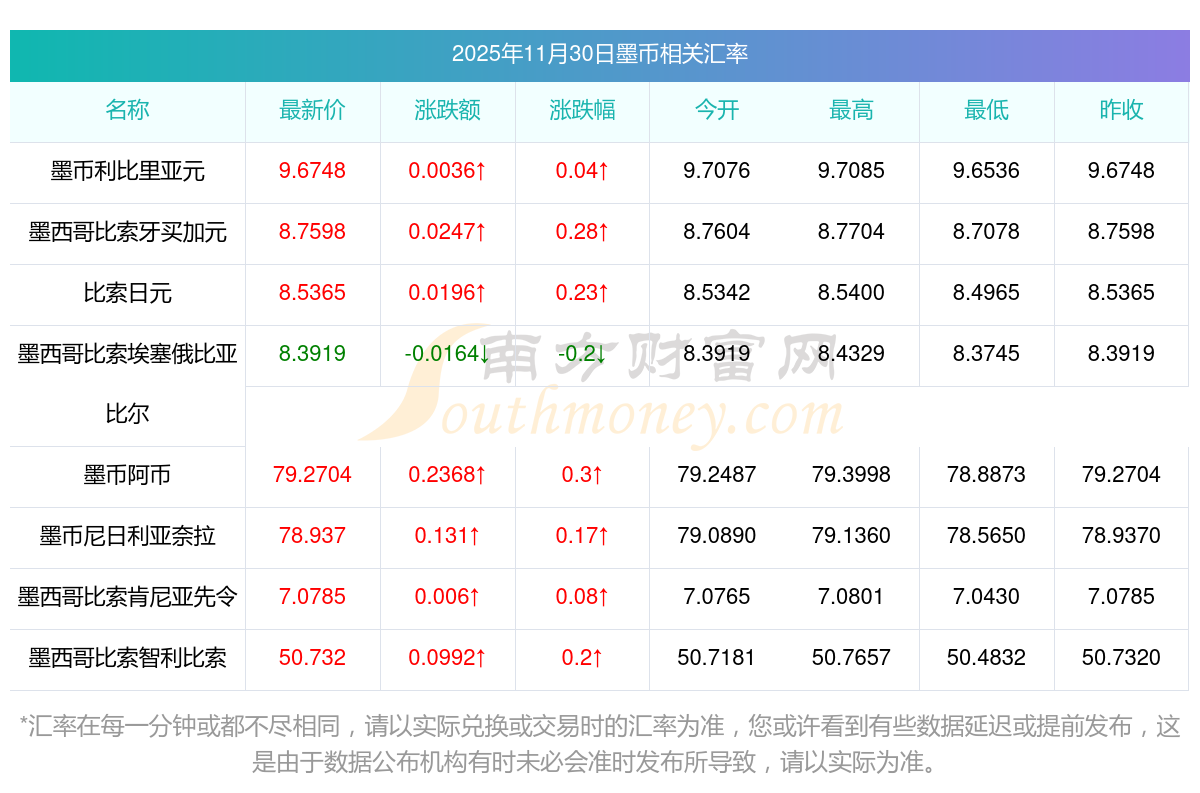 根據(jù)2025年11月30日匯率計算,墨幣兌換馬幣匯率最新價0.225880,今開價0.2258,昨收價0.2259,最高價0.2259,最低價0.2246。