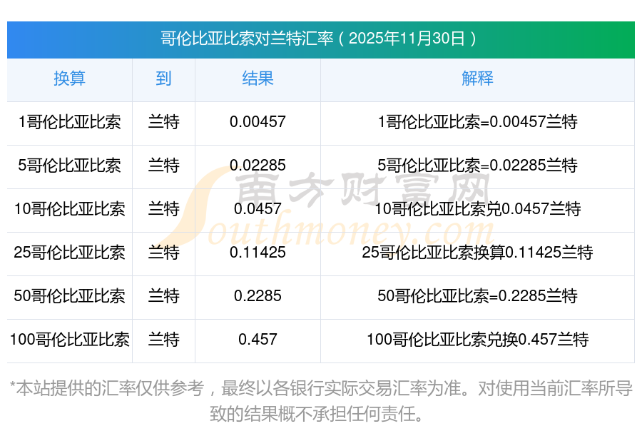今天哥倫比亞比索蘭特匯率多少11-30 ?