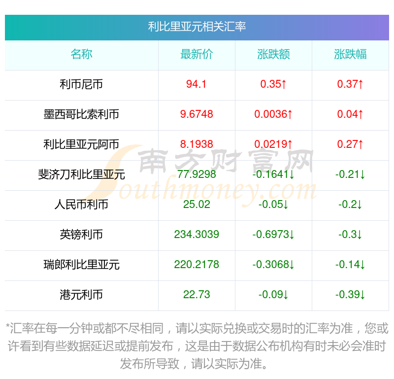 南方財富網(wǎng)為您提供利比里亞元對阿幣匯率最新價格詳情。