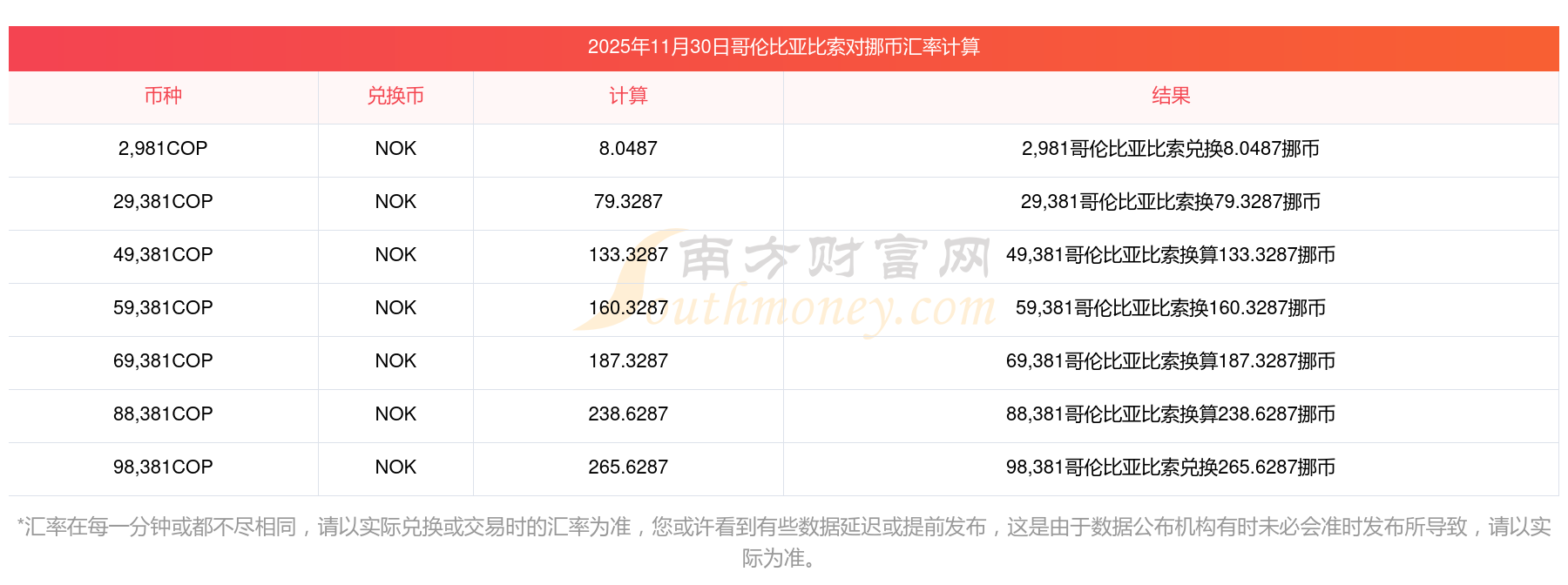 今日30哥倫比亞比索兌換挪幣匯率查詢多少? 2025-11-30