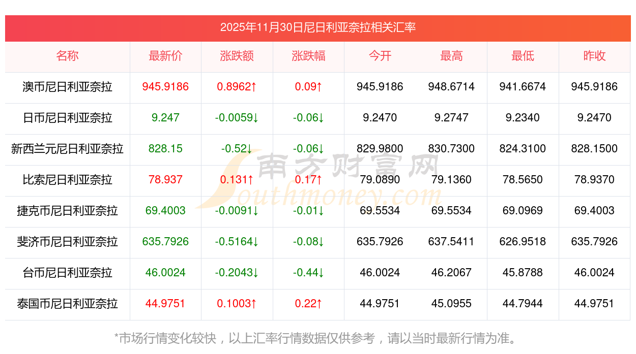 2025年11月30日尼日利亞奈拉相關匯率查詢