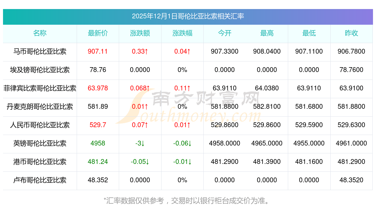 2025年12月1日哥倫比亞比索相關匯率查詢