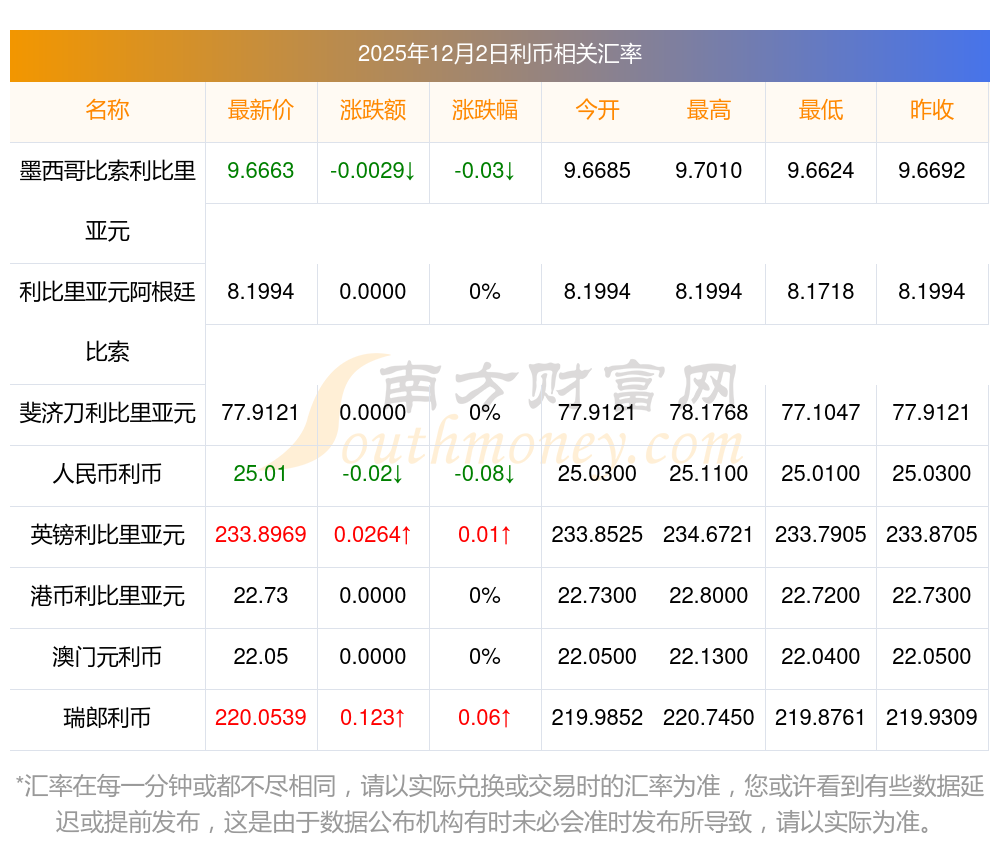 根據(jù)2025年12月2日匯率計算,利幣兌換蘭幣匯率最新價0.096600,今開價0.0966,昨收價0.0966,最高價0.0967,最低價0.0962。