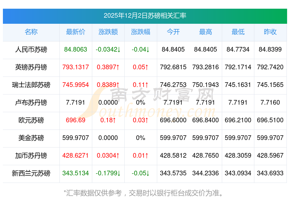 2025年12月2日最新消息,蘇磅兌換日幣最新匯率為0.259498,今開為0.2603,昨收為0.2591,最高為0.2605,最低為0.2578。