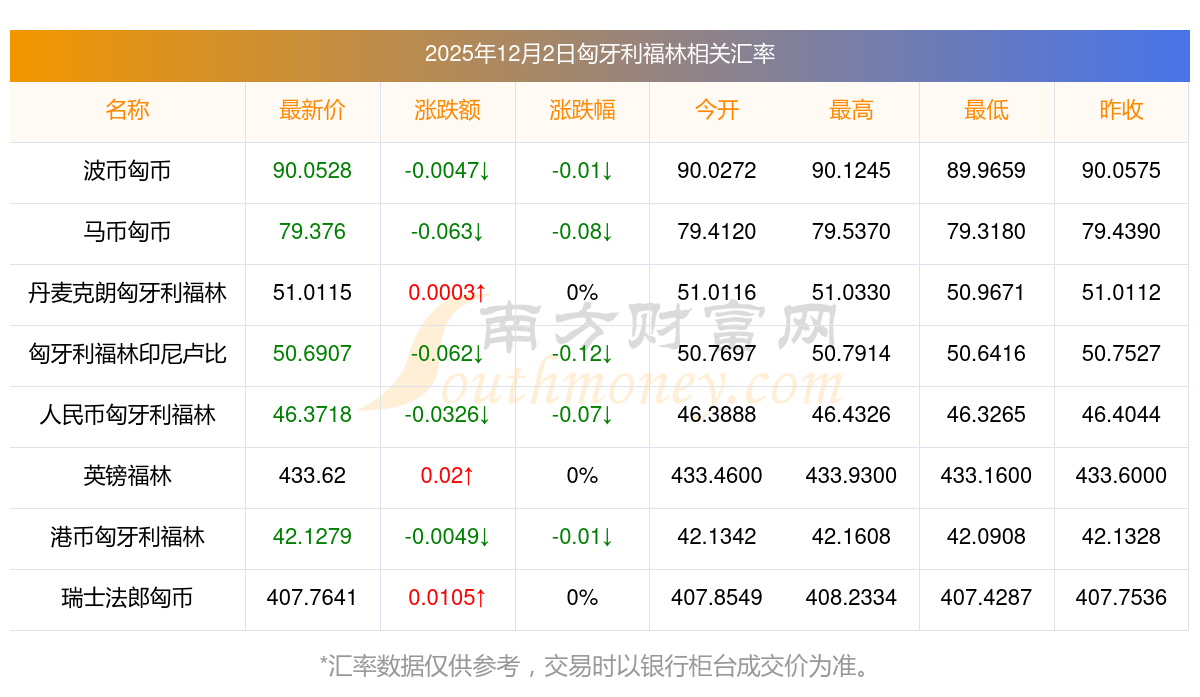 根據(jù)2025年12月2日匯率,匈牙利福林兌換秘魯新索爾匯率最新價0.010281,今開價0.0103,昨收價0.0103,最高價0.0103,最低價0.0103。