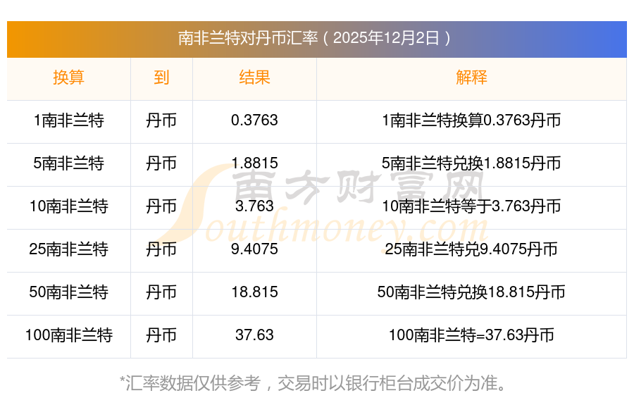 今天匯率:48南非蘭特兌換多少丹幣的?(2025年12月2日)