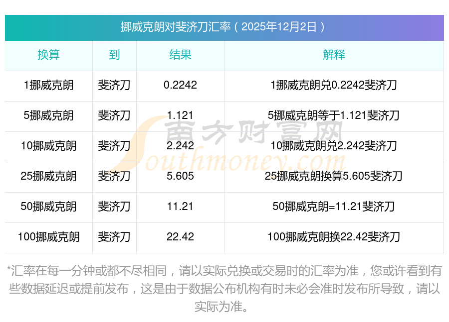 南方財富網(wǎng)為您提供挪威克朗對斐濟刀匯率最新價格詳情。