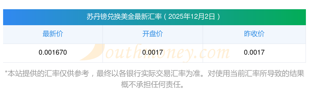 南方財(cái)富網(wǎng)為您提供蘇丹鎊對美金匯率最新價(jià)格詳情。