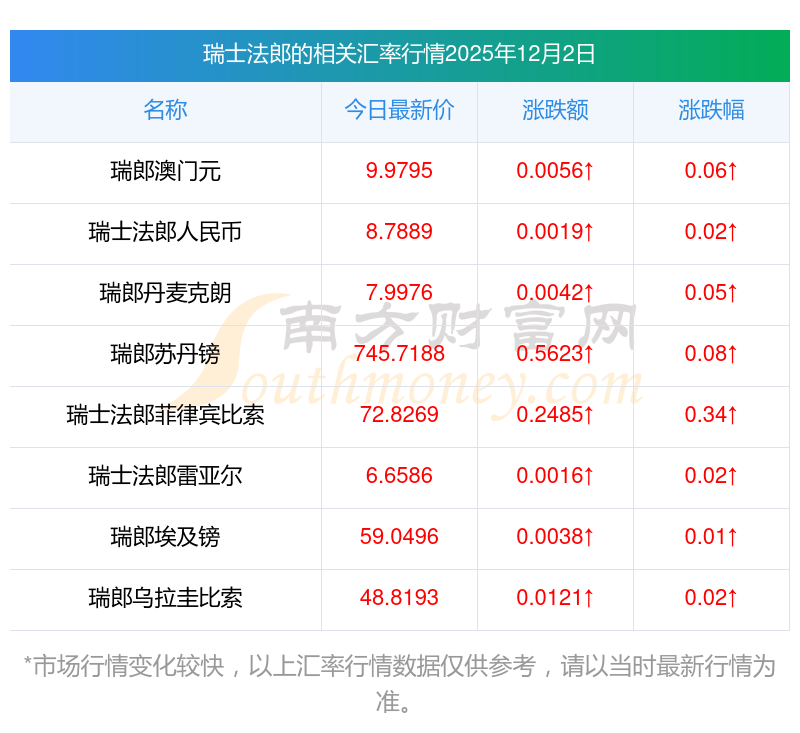 2025年12月2日瑞士法郎相關(guān)匯率查詢