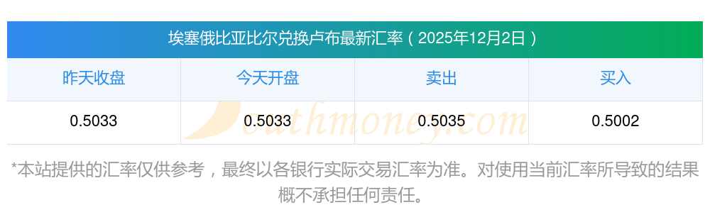 2025年12月2日埃塞俄比亞比爾兌換盧布匯率是:0.5019