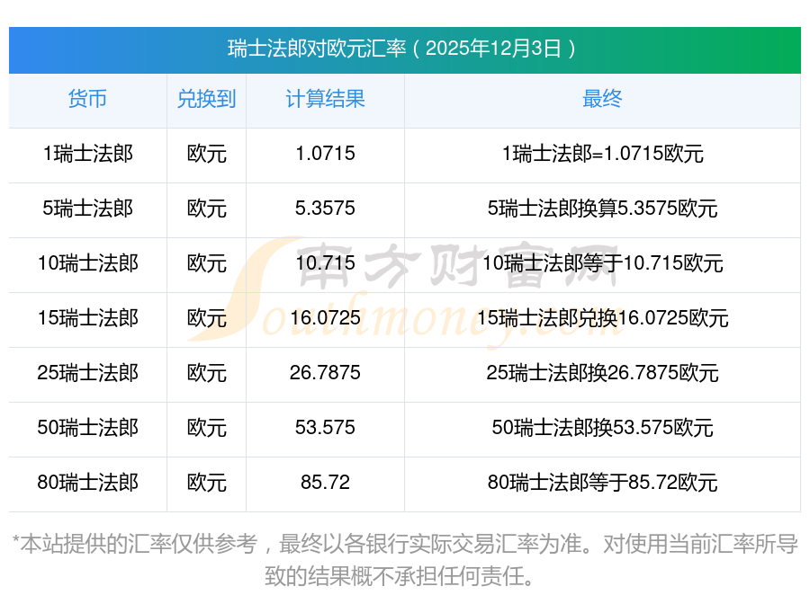 瑞士法郎對歐元折算價如何計算?中間價多少?2025年12月3日