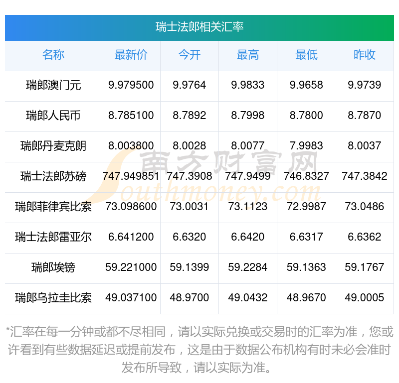 南方財富網為您提供瑞士法郎對歐元匯率最新價格詳情。