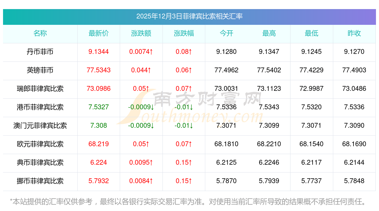 2025年12月3日菲律賓比索相關匯率查詢