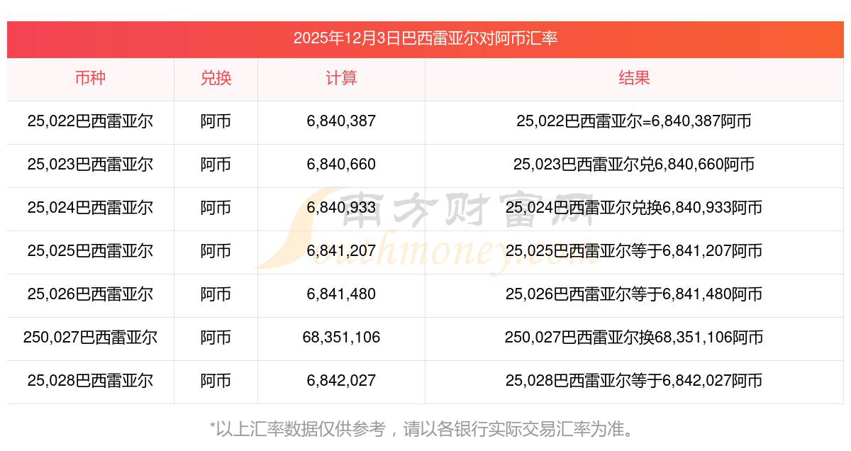 今天巴西雷亞爾購(gòu)匯查詢:今天巴西雷亞爾對(duì)阿幣匯率是多少?2025/12/3