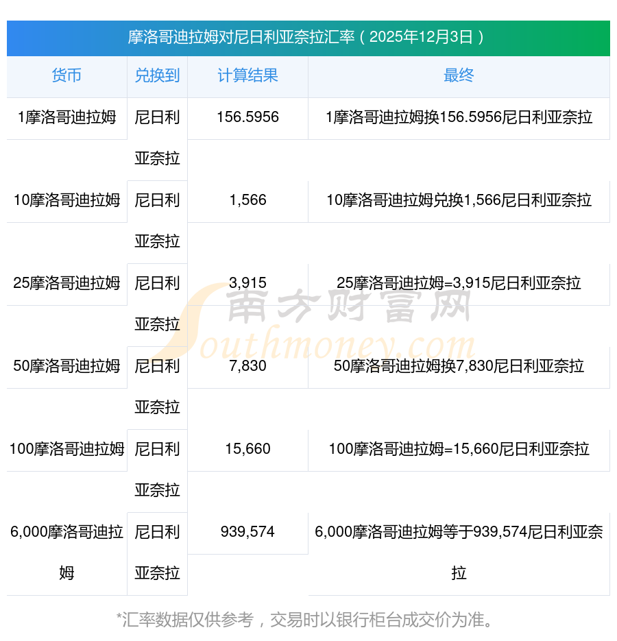 今日摩洛哥迪拉姆對(duì)尼日利亞奈拉匯率大概多少?2025-12-03匯率查詢