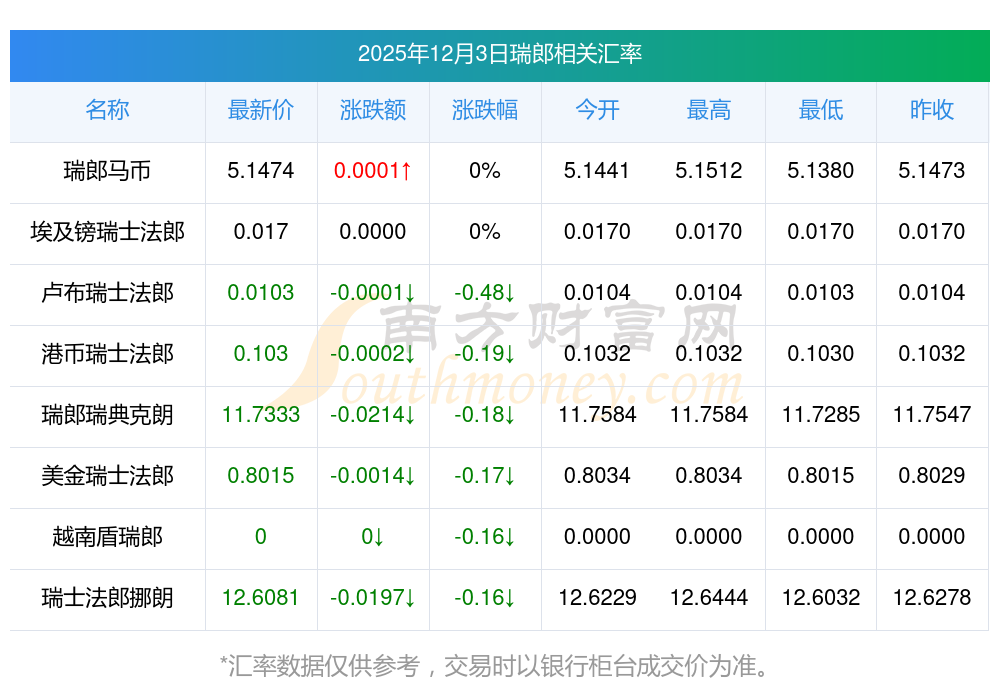 2025年12月3日瑞郎相關(guān)匯率查詢