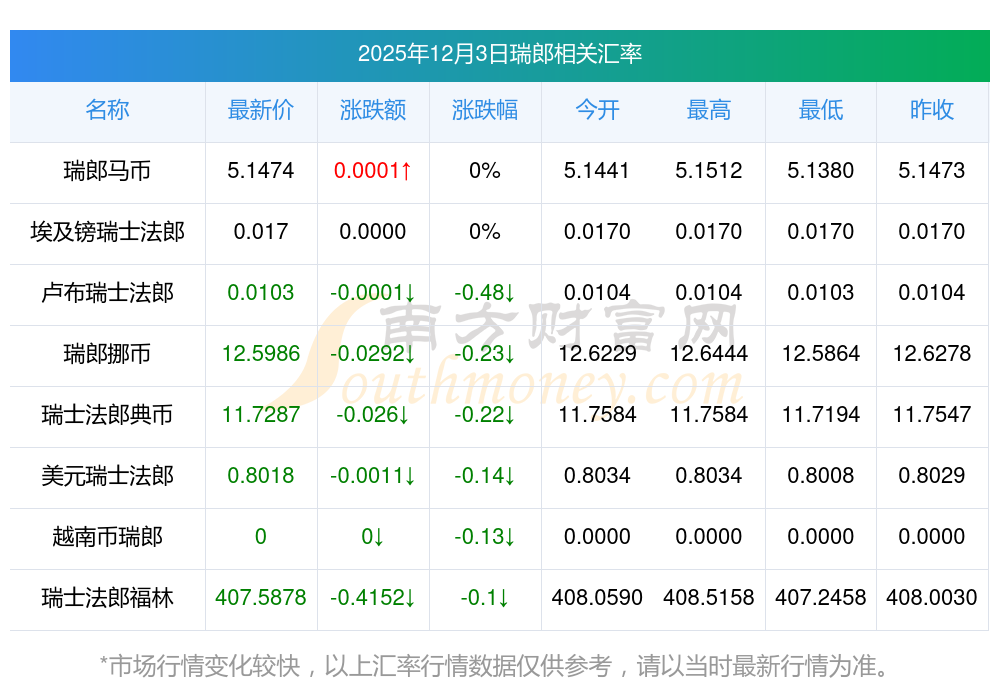 2025年12月3日瑞郎相關(guān)匯率查詢