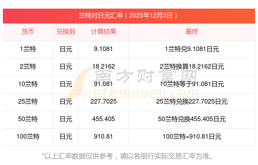 南方財富網(wǎng)為您提供蘭特對日元匯率最新價格詳情。
