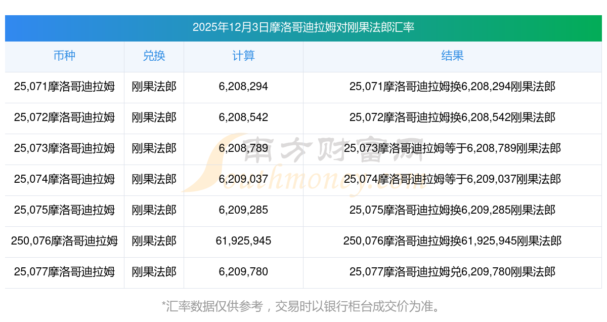 摩洛哥迪拉姆對剛果法郎匯率計算器(2025年12月3日)