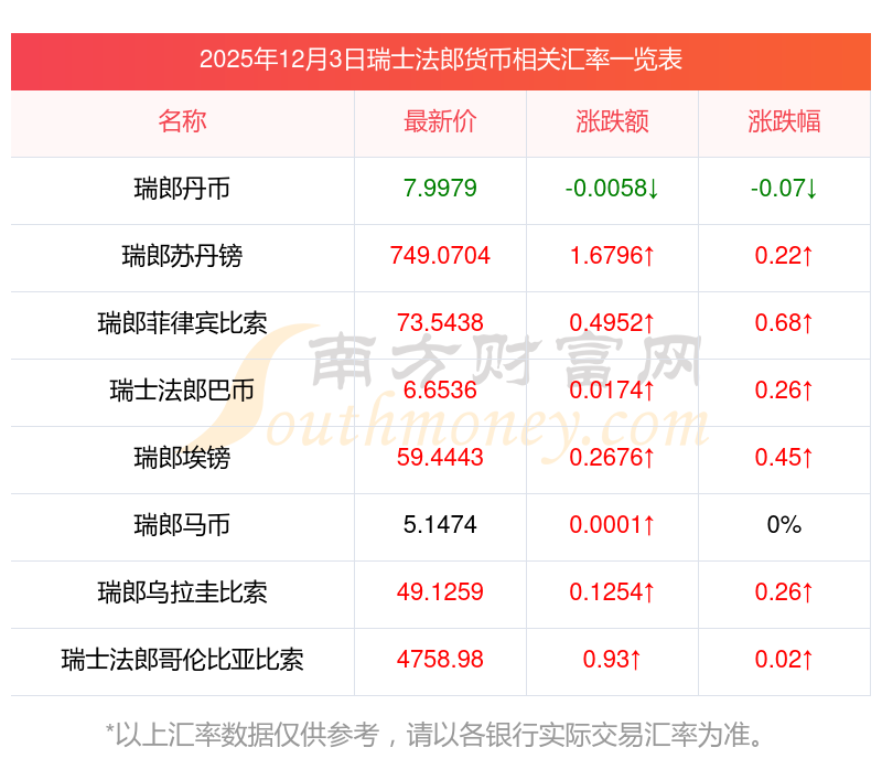 2025年12月3日瑞士法郎相關(guān)匯率查詢